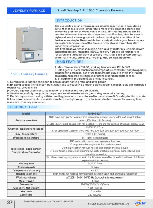M1500-12IT 1500°C jewelry furnace is equipped with safety features such as thermal insulation, overheat protection, and automatic shut-off systems. These features help ensure safe operation and protect both equipment and personnel from potential hazards.