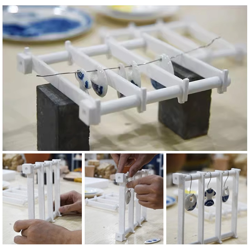 Crafted from high-temperature resistant materials and equipped with tungsten wire, designed specifically for hanging or string firing small ceramic jewelry and other ceramic items. If additional height is needed, multiple racks can be stacked together.