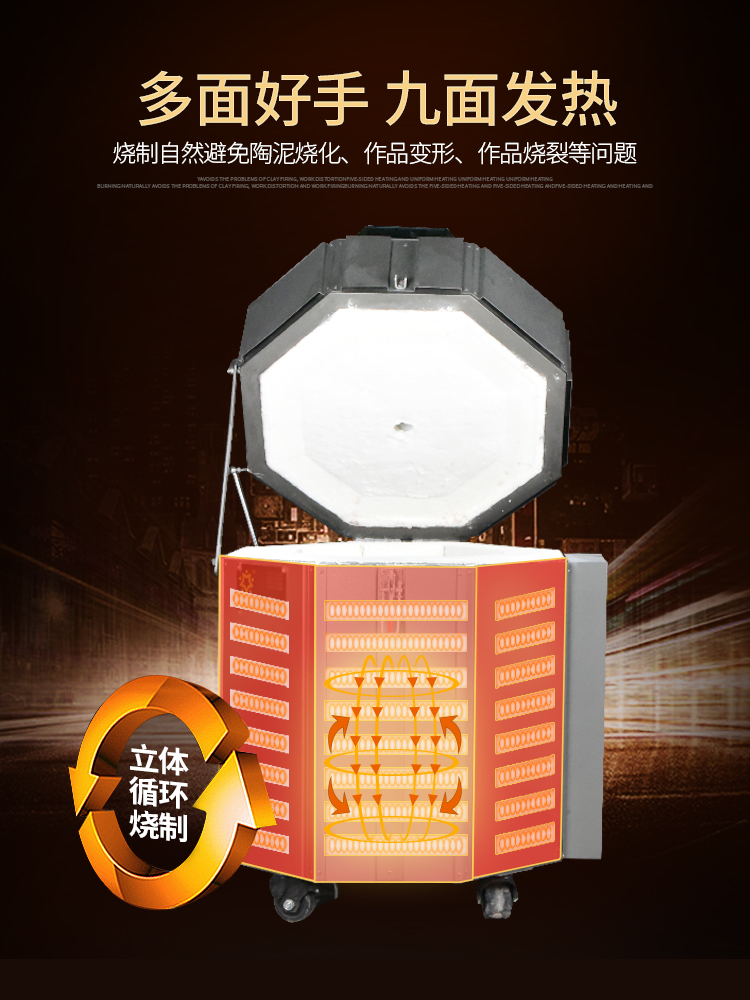 2. 8 sides and bottom are surround the heating wire, the three-dimensional circulation is heated in all directions. The firing is even and natural to avoid problems, such as clay burning, work deformation, work burning crack, and the finished product is better.