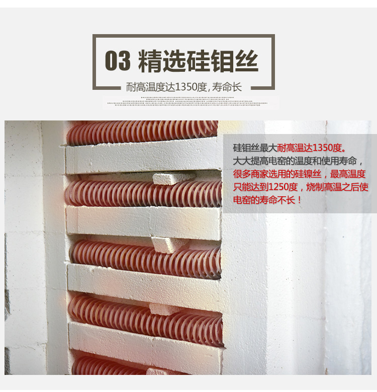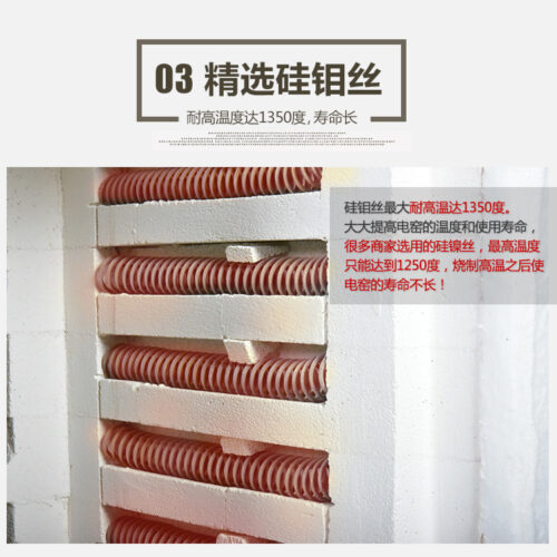 3.The maximum temperature of selected silicon molybdenum wire is 1350.C, long service life. And the temperature and service life of the electric kiln have been greatly improved. The maximum temperature of silicon nickel wire selected by many manufactures can only reach 1250.C. The life of the electric kiln will not be long after firing at high temperature!
