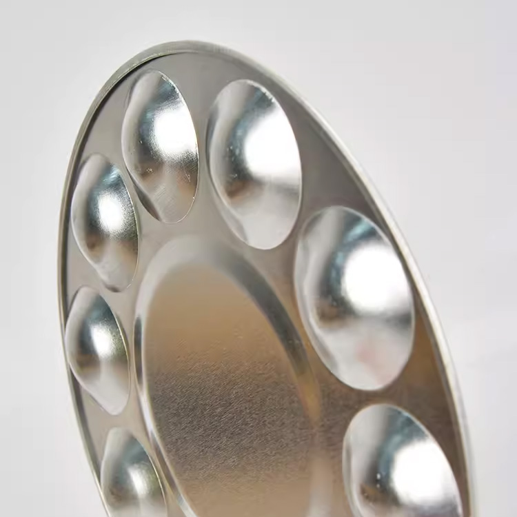 Aluminum Color Palette: An aluminum color palette is crafted from aluminum material to prevent paint infiltration. With deep circular grooves designed to hold up to 10 colors, it facilitates easy cleaning and offers practicality. Primarily used in ceramic art for mixing and applying pigments.