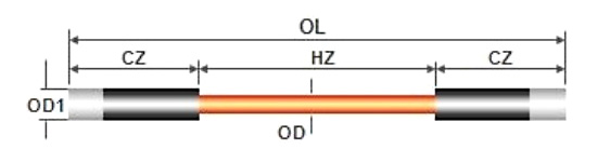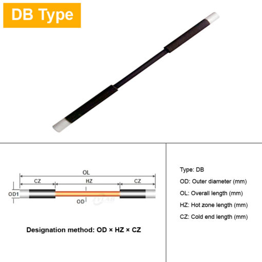 The DB Type Silicon Carbide Heating Element features a uniform-diameter hot zone (HZ) with two equal-diameter cold ends (CZ). This element is optimized for vertical or horizontal installation in high-temperature furnaces operating up to 1500°C. Its unique configuration minimizes terminal heat loss and improves thermal efficiency, making it ideal for industrial heat treatment, ceramics sintering, and laboratory furnaces.