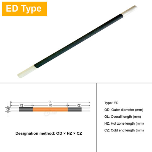 The ED type SiC heating element consists of three sections: a central hot zone (heating section) and two cold ends. The cold ends are impregnated with metallic silicon to lower their electrical resistance and operate at lower temperatures, improving energy efficiency. Electrical connections are made using aluminum braid straps attached to low-resistance contact coatings on the terminals.