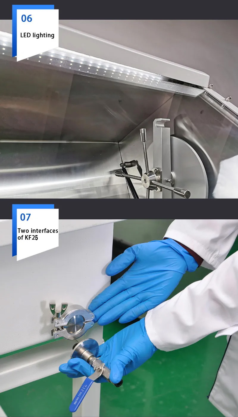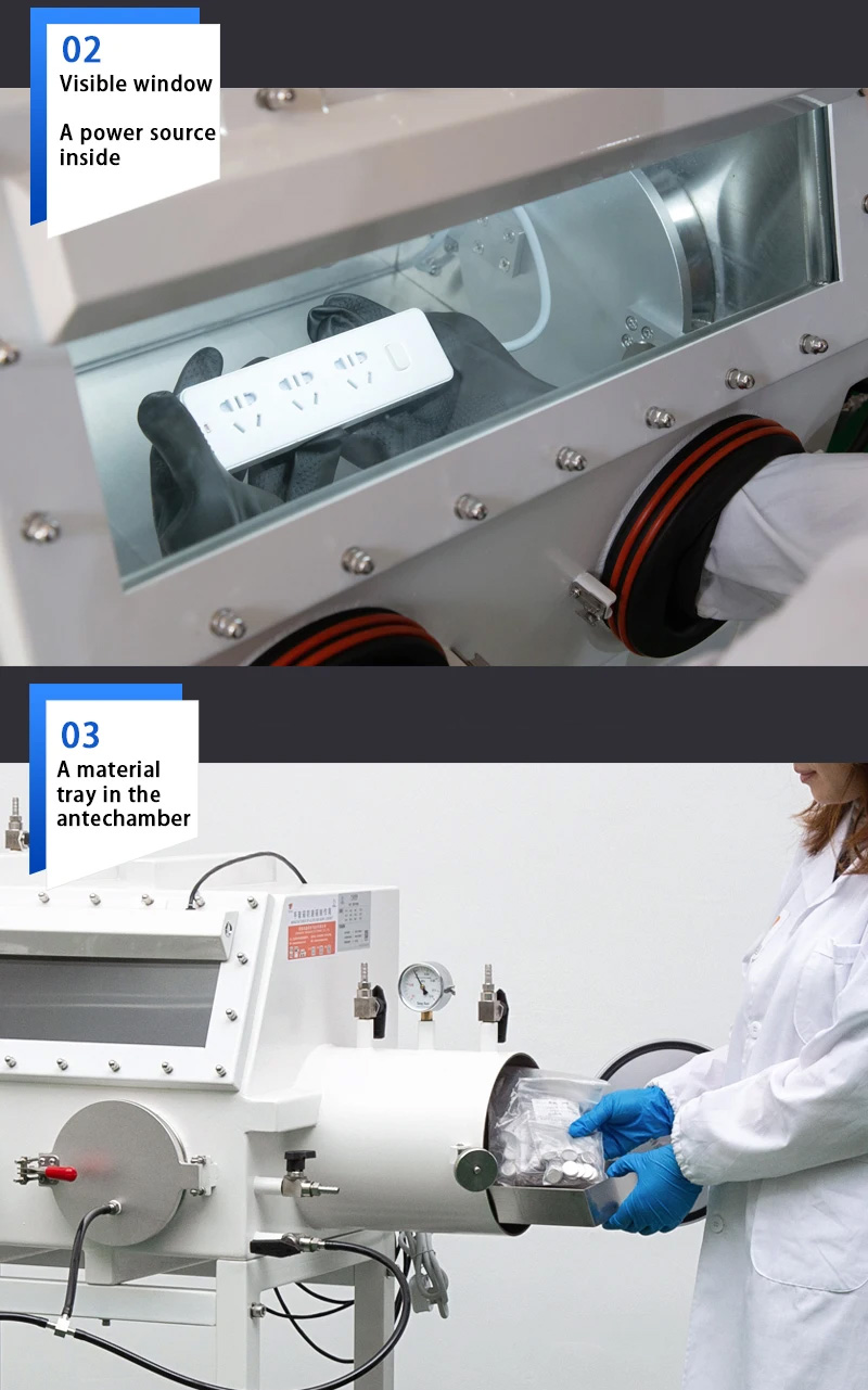- Purification System: After vacuuming inert gas, water and oxygen levels remain around 200PPM. The purification system can achieve water and oxygen levels below 1PPM.
