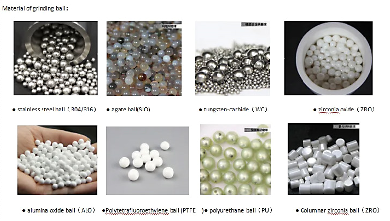 Agate ball, zirconium ball, stainless steel ball, polyurethane ball, alumina ball, tungsten carbide ball, PTFE ball, silicon carbide ball, silicon nitride ball, etc.
