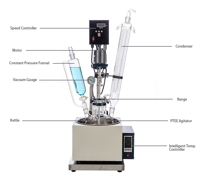 Lab Glass Reactor operating principle: put reaction materials into single-layer glass reactor, and vacuumize to stirring reaction simultaneously; add water or oil into outside water or oil bath to proceed heating reaction; control evaporation and back-flow of reaction solution, and charging under constant voltage . (optional refrigeration modules matched with refrigeration sources to proceed low-temperature reaction).