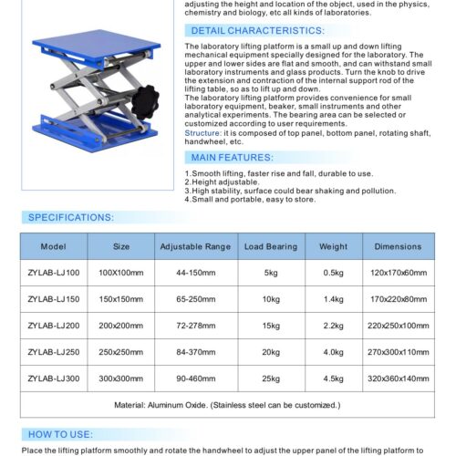The laboratory jack provides convenience for small laboratory equipment, beaker, small instruments and other analytical experiments. The bearing area can be selected or customized according to user requirements.