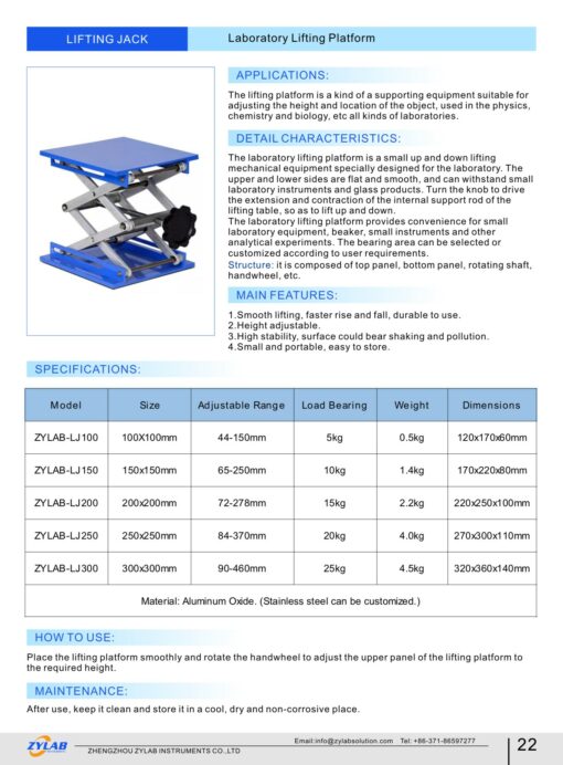 Overall, laboratory jacks are essential tools in the laboratory, providing precise height adjustment and support for a wide range of experimental setups and applications. Their versatility makes them indispensable for researchers, technicians, and educators alike.