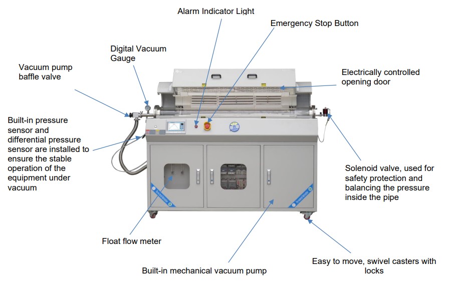 | 4 | Opening method | Electrically open or close the furnace chamber through screen buttons for easy viewing of sample position and replacing the furnace tube | |