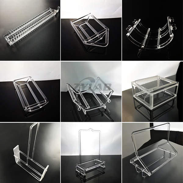 The Quartz Wafer Holder is a specialized tool used in various laboratory and industrial applications, particularly in semiconductor manufacturing, material testing, and other high-precision processes. Quartz is chosen for its high thermal stability, resistance to thermal shock, and low contamination risk, making it ideal for handling delicate wafers in processes such as etching, deposition, and annealing.