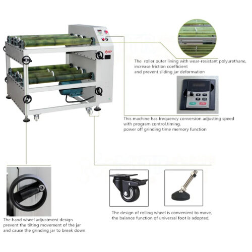 - The roller axis distance is adjusted by a handwheel to prevent horizontal movement of the jar.