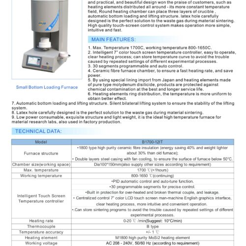 Electric lifts design greatly simplify the loading step, much safer. Compact and practical, and beautiful design won the praise of customers, such as heating elements distributed all around – its more constant temperature field, Round heating chamber can place three layers of crucible , automatic bottom loading and lifting structure. latex hole carefully designed is the perfect solution to the waste gas during material sintering.