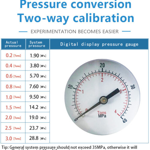 | Analog pressure gauge | Analog pressure gauge is included in the standard package, dual scale display: Mpa and Ton | ||||