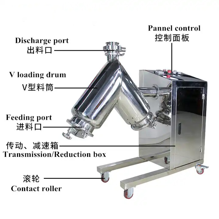 V shape mixer are widely used in the efficient mixing of powdery and granular materials in pharmaceutical, chemical, food, light industry, electronics, machinery, mining and metallurgy, national defense industry and various scientific research units.