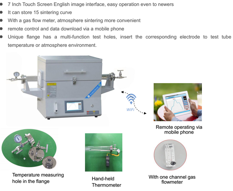 Precise and advanced touch screen auto temperature controller, high temperature accuracy, easy operation, excellent heat-insulation effect, symmetrical temperature uniform and can work under inert atmosphere and vacuum.